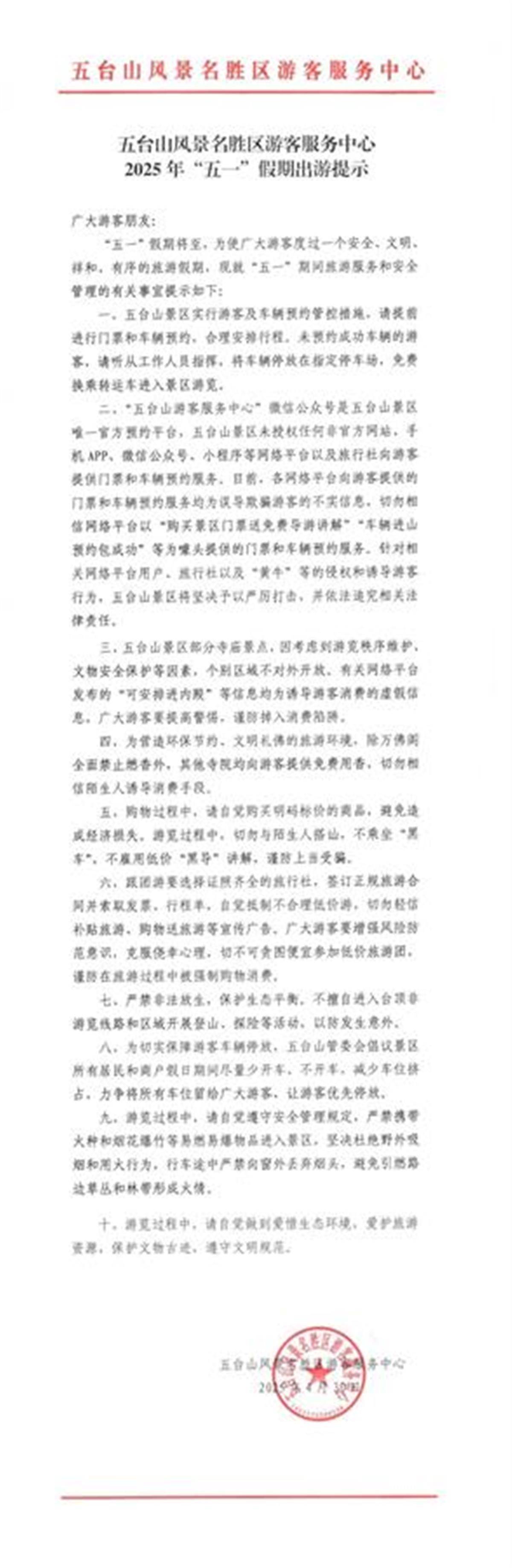 记者采访当地作念旅游包车的司机得知,由于五一假期首日,前来道贺的旅客相配多,五爷庙和殊像寺照旧是东谈主山东谈主海,很难预约,东谈主好多的时候,五爷庙列队进去起码要三四个小时,殊像寺列队时候稍稍短一些。4月30日,五台山旅客就业中心官方微信发布五一时代假期出游教导:五台山景区履行旅客及车辆预约管控法子,请提前进行门票和车辆预约,合理安名次程,未奏效预约车位的旅客,请将车辆停放在指定泊车场,免费换乘转运车参加景区游览。为保险旅客车辆停放,五台山管委会倡议景区扫数住户和商户沐日历间尽量少开车、不开车,减少车位挤占,力求将扫数车位留给众多旅客,让旅客优先停放。