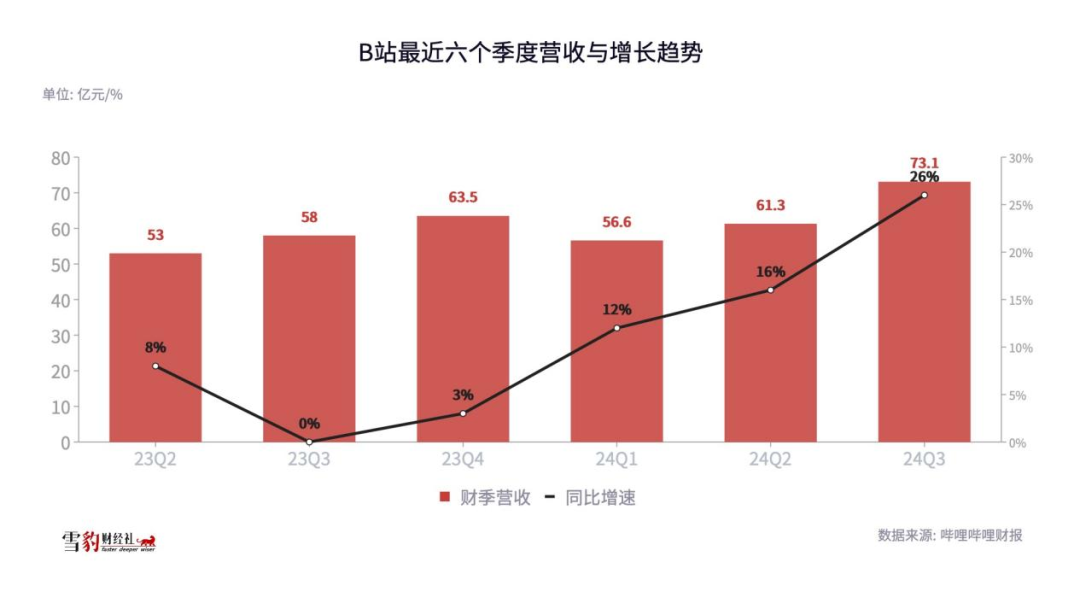 在2023财年第四季度(Q4)财报电话会上,哔哩哔哩(以下简称“B站”)董事长兼CEO陈睿强调,“竣事盈利意见”是B站2024年最进攻的使命之一。而在2024年的Q3,这个意见终于达成:营收73.1亿元,同比增长26%,休养后净利润2.4亿元,是上市后初度竣事单季度盈利。