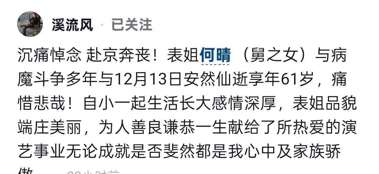 曾被赞为“古典绝色佳东说念主”的何晴,永远地离开了东说念主世,常年61岁。