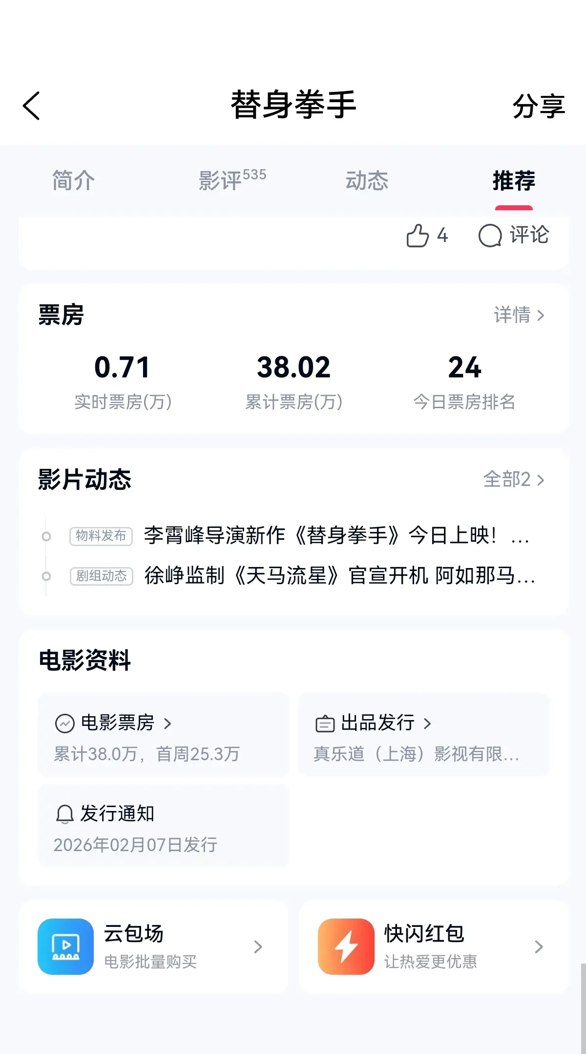 从官方发出的数据上看,这部电影的首日票房才达到15万,上映两天之后,才冲突20万,截止咫尺,《替身拳手》刚冲突38万。这部电影的制作成本高出4000万元,要是票房不快速高涨的话,耗费吊唁常大的。