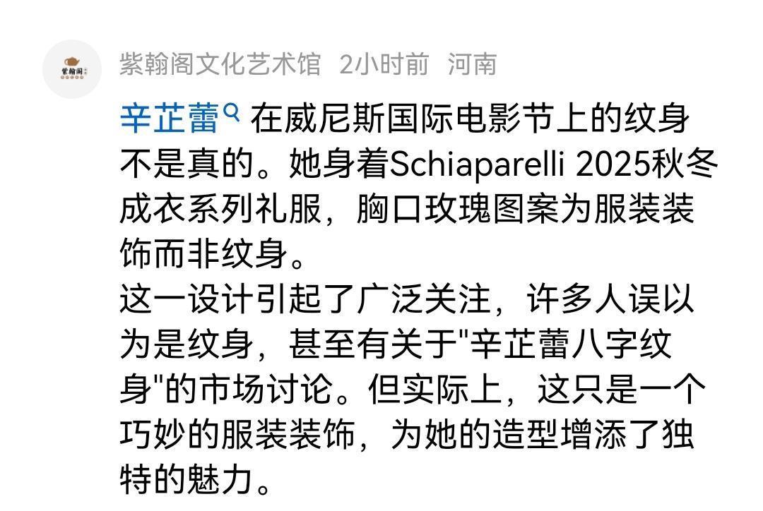 一位来自河南的网友在辩驳区留言,辛芷蕾在威尼斯国际电影节上的纹身不是确切。她身着Schiaparelli 2025秋冬裁缝系列驯顺开云体育(中国)官方网站,胸口玫瑰图案为服装讳饰而非纹身。 闹了半天,本来是一个秀气的歪曲,其实巨匠之是以歪曲,亦然因为怜惜辛芷蕾,不但愿这样一位干净漂亮的女生有纹身。 关于这样的事情,巨匠有什么想法呢?