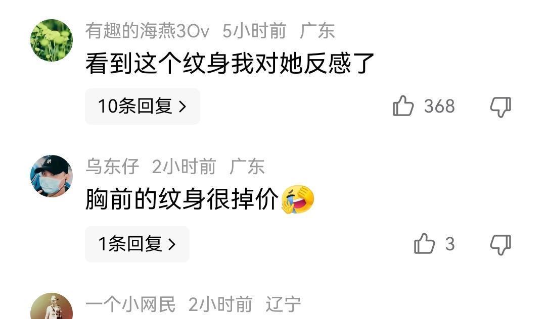 是以辛芷蕾纹身的事情很快就冲上了热搜,而且在网上引起了山地风云,一位来自广东的网友在辩驳区留言,就因为这个纹身,让我方对辛芷蕾产生了反感,网友们以为,她胸前的纹身很掉价。