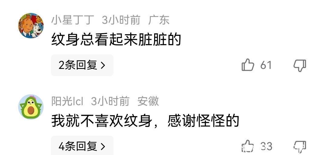 一位来自安徽的网友在辩驳区留言,不心爱纹身,总嗅觉怪怪的,脏脏的,看得出来,辩驳区的绝大部分网友齐是对纹身的事情很反感,这便是东方东谈主的传统想想。