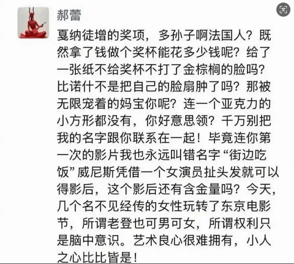 这片子,拿了一个第78届戛纳电影节的“特别奖”。前几天,一个疑似“郝蕾的一又友圈”的现实在互联网上传播,影迷们应该都知说念了。这个现实如下: