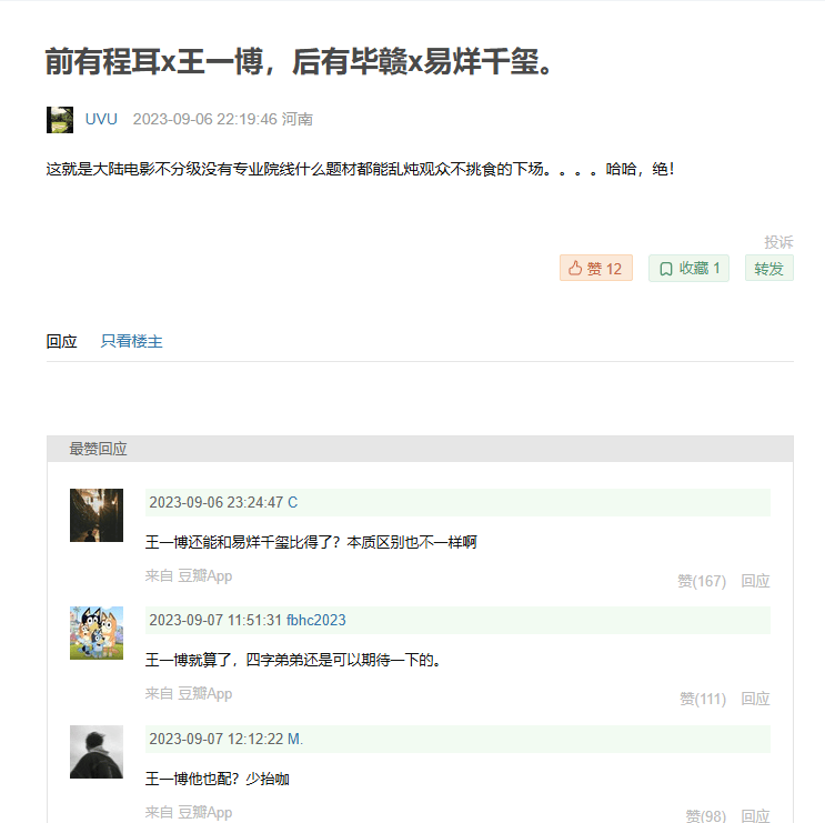 况兼,这部《狂野期间》因为去了戛纳,让好多专科影迷看到了,是以,它的口碑就径直发酵了啊。那批影迷,可不是茹素的。行,是真捧,不能,是真踩啊。这部电影在豆瓣的短评区域,大面积的差评啊,易烊千玺的粉丝帮着爱戴口碑,都难啊。