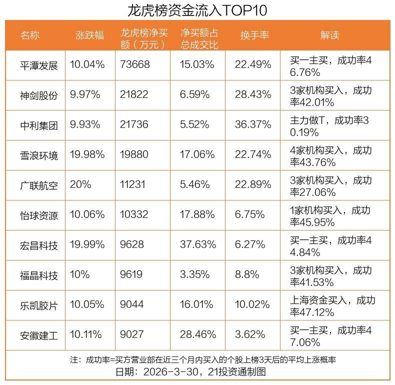 3月30日,上证指数高潮0.24%,深证成指下落0.25%,创业板指下落0.68%。盘后龙虎榜数据泄漏,共有48只个股因当日异动登上龙虎榜,资金净流入最多的是平潭发展(000592.SZ),达7.37亿元。