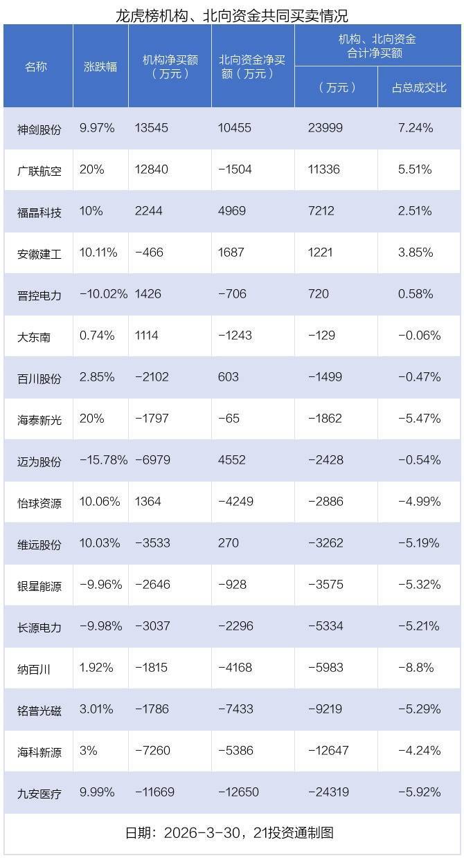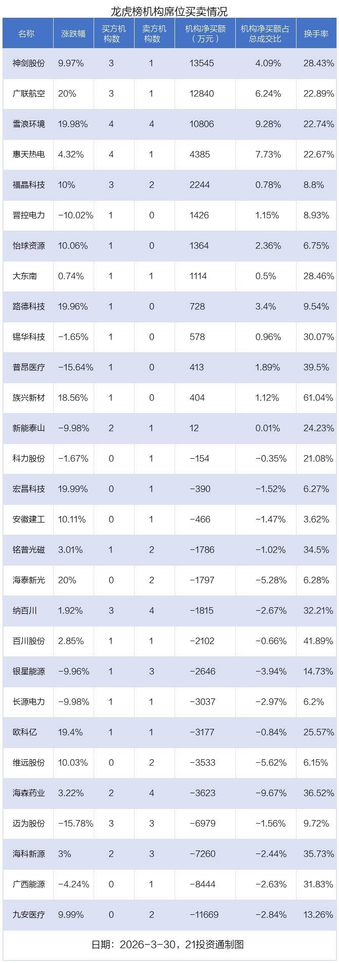 3月30日,29只个股龙虎榜出现了机构的身影,机构磋磨净卖出9019.95万元。具体来看,机构净买入13股,净卖出16股。