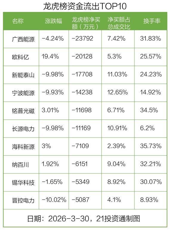 而龙虎榜中资金净流出最多的是广西动力(600310.SH),被净卖出为2.38亿元,占总成交金额的7.42%。广西动力收盘下落4.24%,换手率为31.83%。