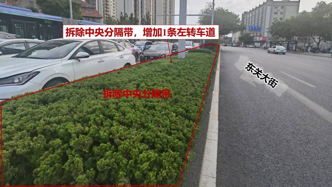设施:撤消东关大街(东圩门外街-历山路段)中央分隔带,西进口增多1条左转车谈;中央分隔带改护栏,完善交安智力。