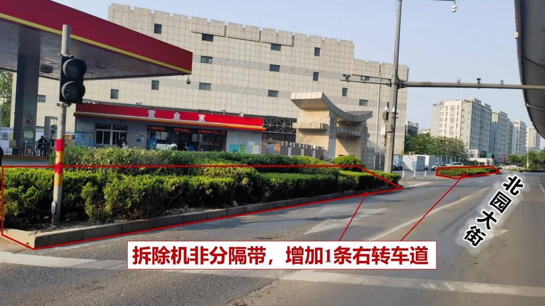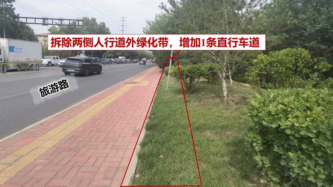 设施:压缩东、西进口东谈主行谈外侧绿化带宽度,东、西进口均拓展1条直行车谈。