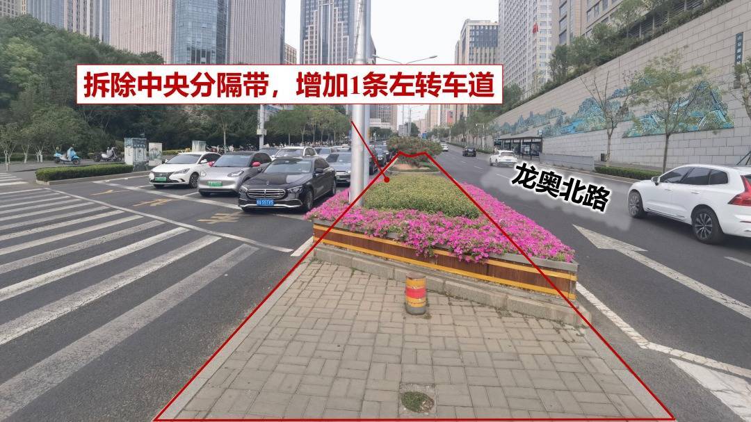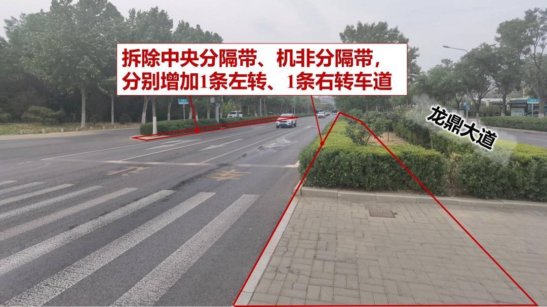 设施:撤消东进口中央分隔带,拓展1条左转车谈(含可变车谈灵活调配)。