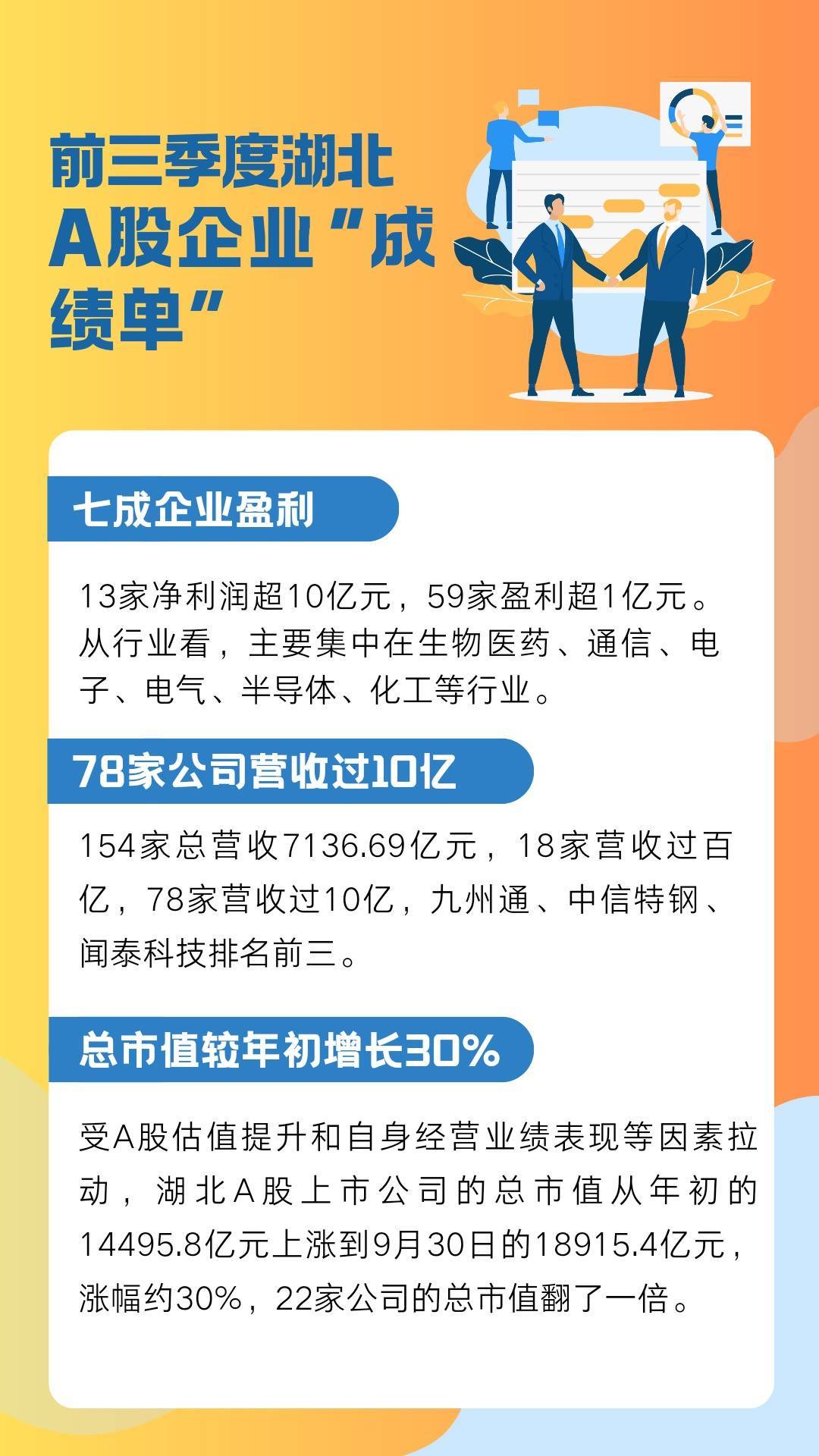 湖北日报讯(记者王艳华)限度10月31日,湖北A股上市公司三季报显露结束。总体来看,154家公司前三季度总营收7136.69亿元,归母净利润约335亿元,7成公司结束盈利。