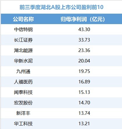 前三季度盈利名次前10位的湖北A股上市公司。