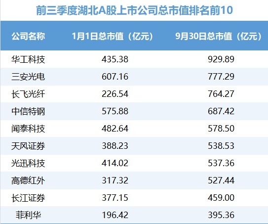 受A股估值擢升和自己标的事迹弘扬等成分拉动,本年以来湖北A股上市公司的总市值从年头的14495.795亿元高涨到9月30日的18915.4128亿元,涨幅约30%。限度9月30日,47家公司总市值超百亿元,22家公司的总市值较年头翻了一倍。