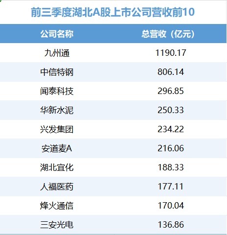 前三季度营收名次前10的湖北A股上市公司。