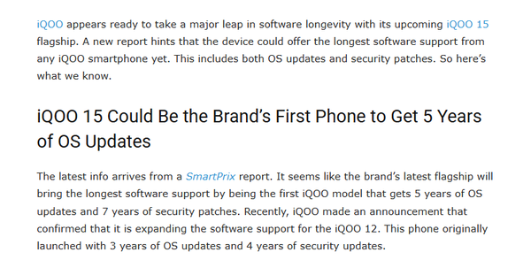 【CNMO科技音书】据国际科技媒体报谈,vivo旗下子品牌iQOO行将发布的旗舰新机iQOO 15有望在软件维持周期上实现要紧冲突。该机型或将成为iQOO历史上首款提供长达5年操作系统(OS)更新和7年安全补丁的智高东谈主机,显耀延迟居品质命周期,进步用户永久使用体验。
